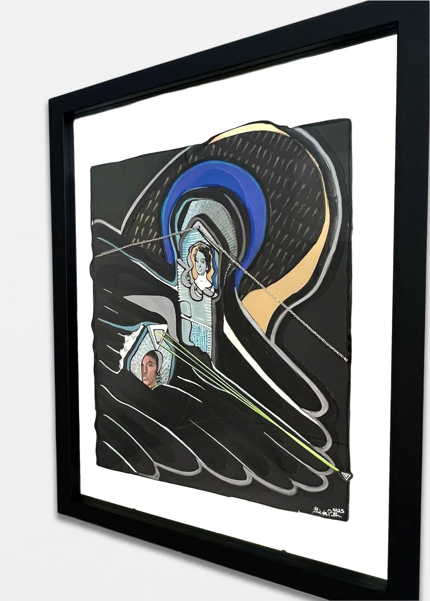 Tar paper, Recycled leather, Thread, Chain, Screen pint on paper, Acrylic paint, Glass, Wood 3-D printed parts, Film strips.