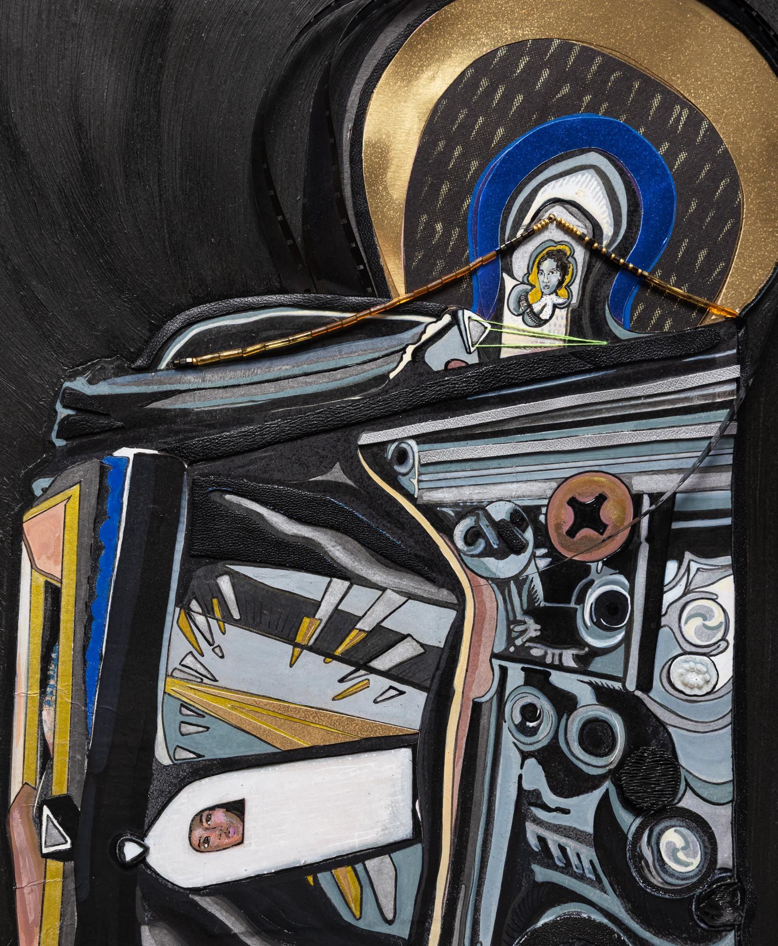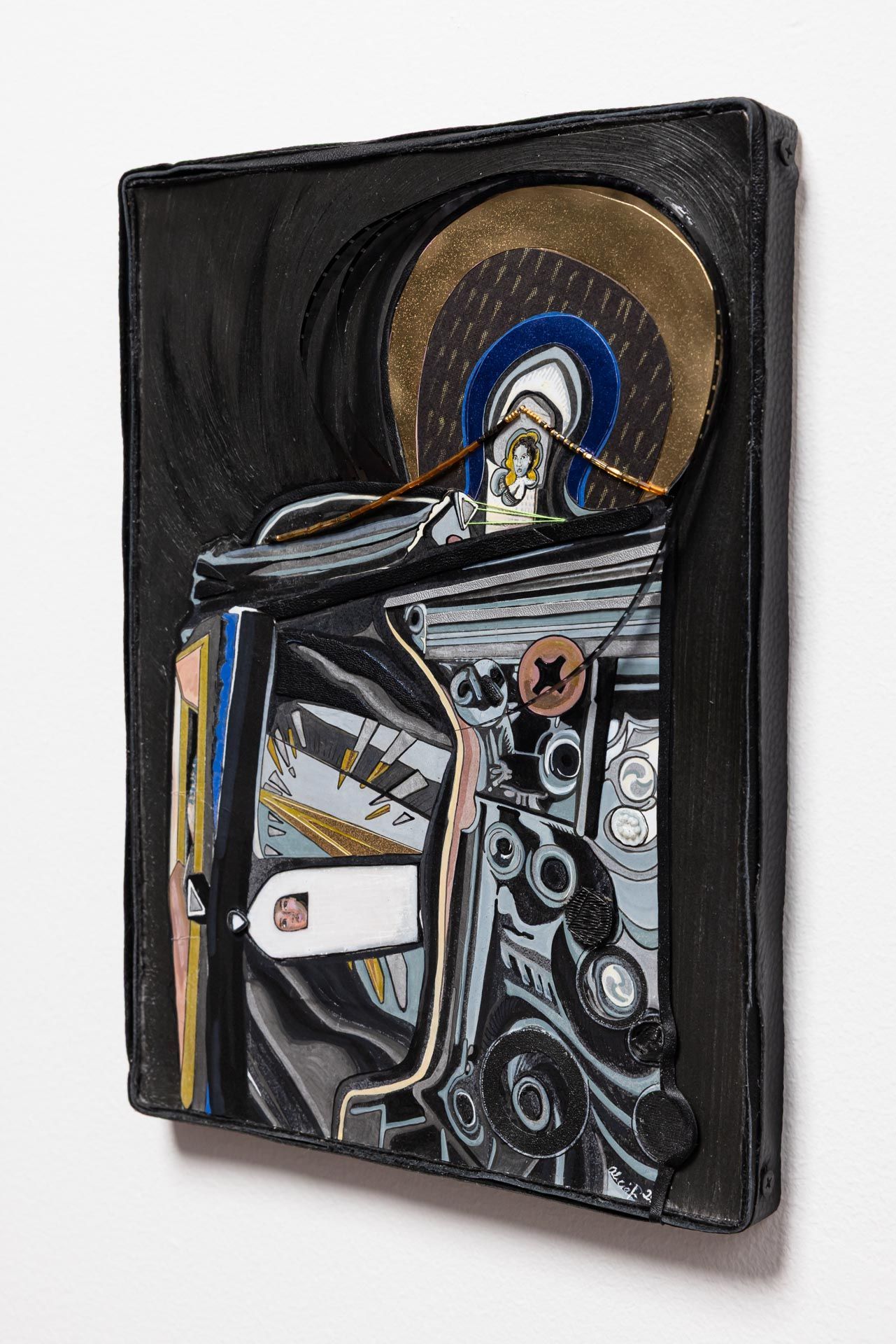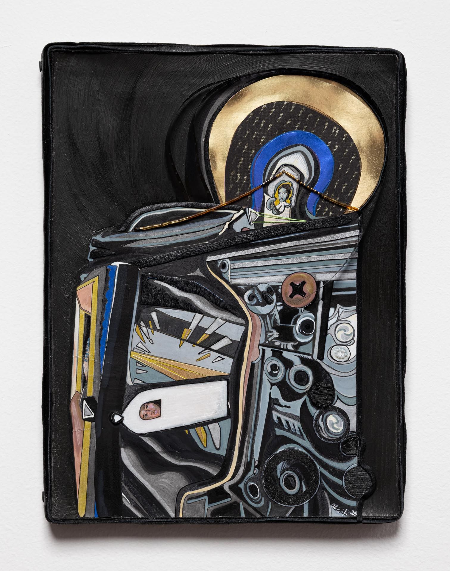 Recycled leather, Acrylic paint, Wood, Tile, Resin, Foil paper.