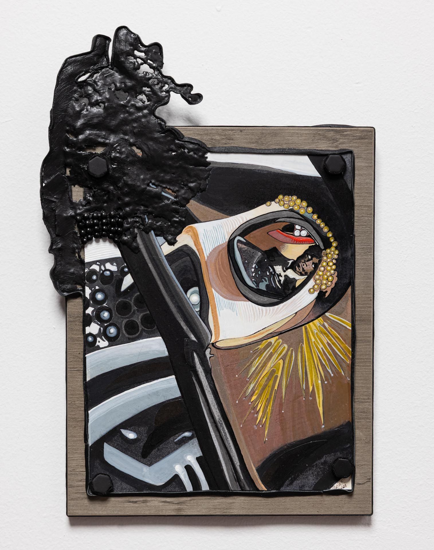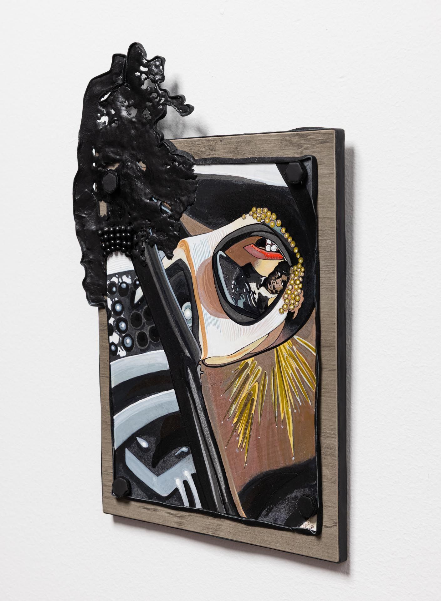 Recycled leather, Acrylic paint, Wood, Tile, Metal, Resin, Foil paper.