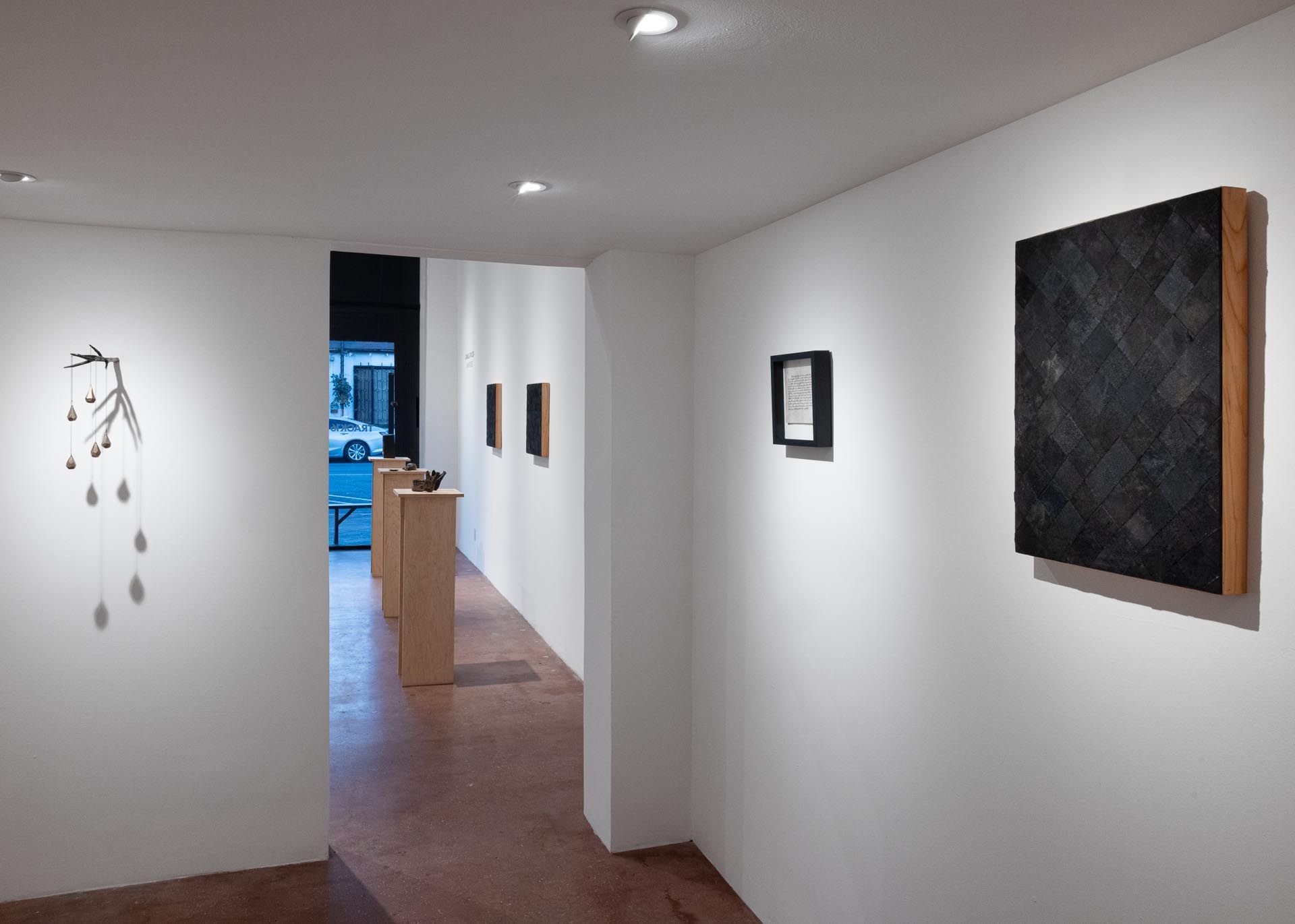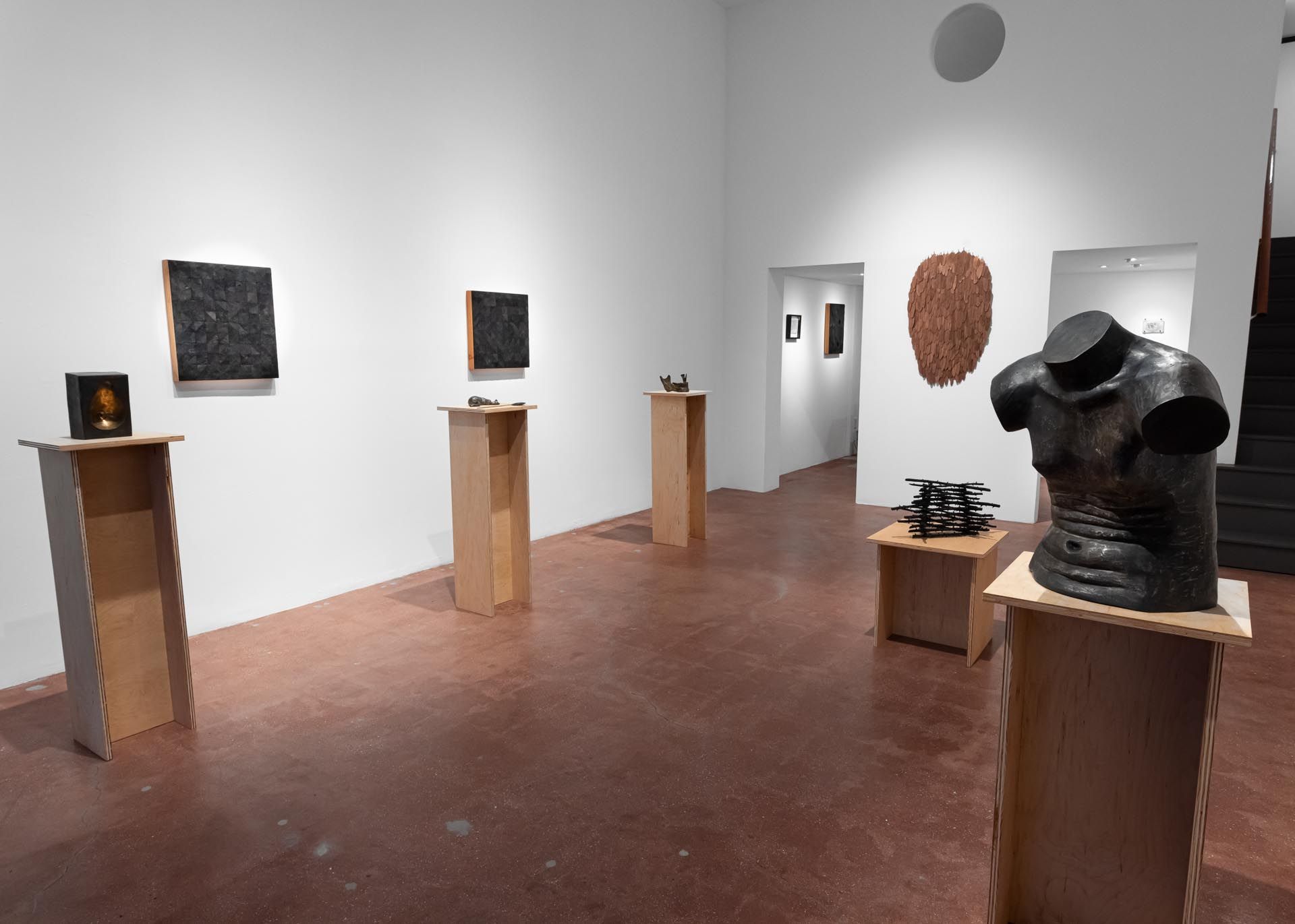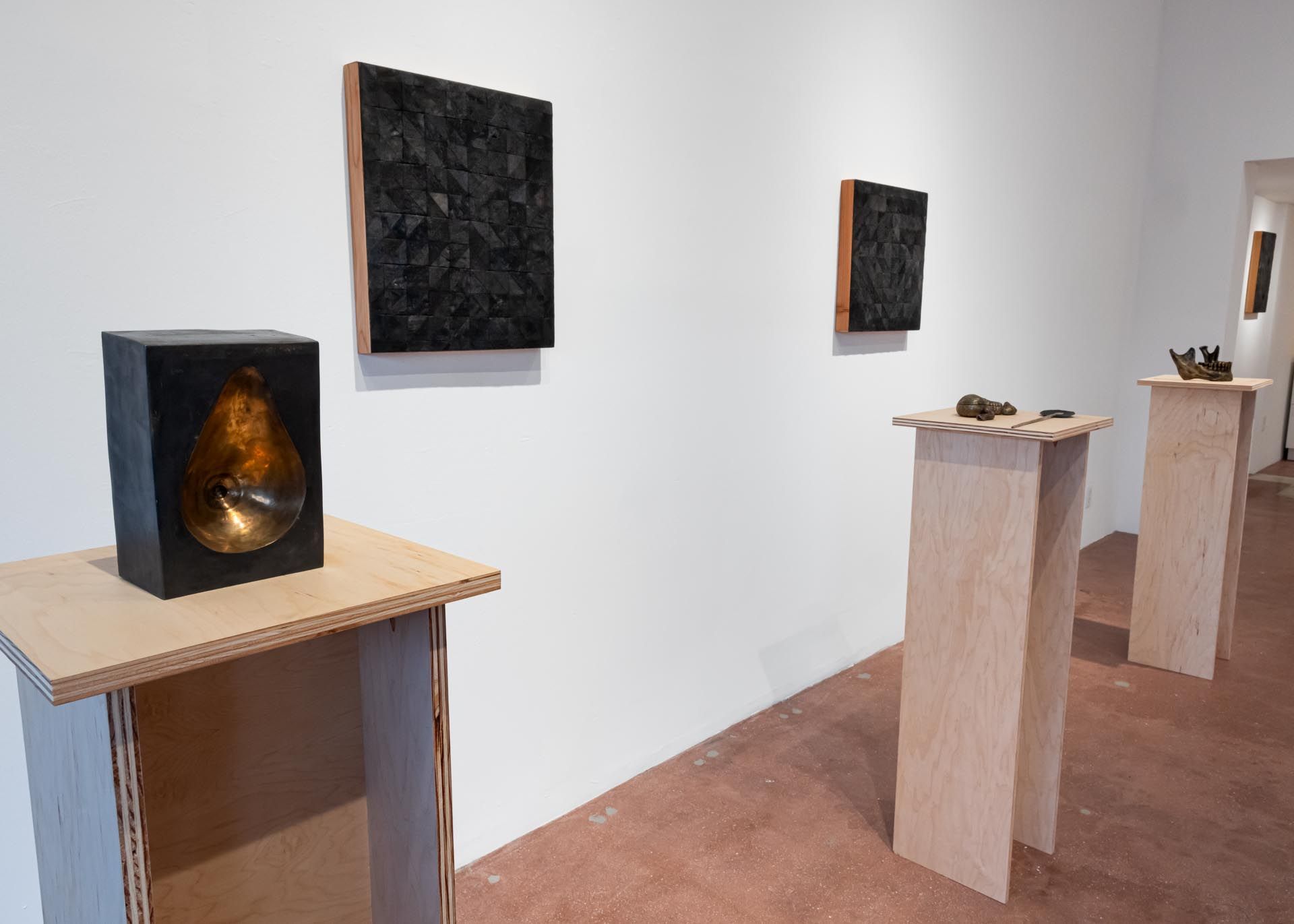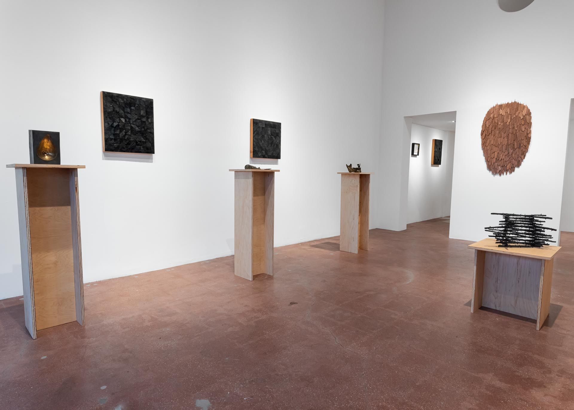 Recent residencies for Taylor had allowed deeper examination of the natural world. During a 2024 residency on Vashon Island in the Pacific Northwest, Taylor sculpted and cast bronze blackberry branches. Sanctuary – the only artwork in the current exhibition that survived and were blackened by the flames – are stacked into a triangular-shaped structure. In pagan witchcraft this is a symbol for fire or water, depending on the triangle’s orientation. Introduced to the Northwest in the 19th century, the thriving Himalayan blackberry is a bane and a bonus. The berries are everywhere to eat, but have effectively crowded out native plants and upset the balance of the ecosystem. That push-pull is reminiscent of fire in California, where, historically, it was a natural cycle for a healthy system. Contemporary suppression protects communities near the forests, but the build-up of fuel creates conditions for overwhelming destruction.
