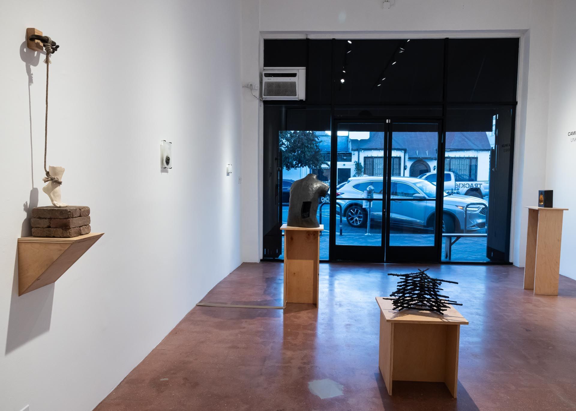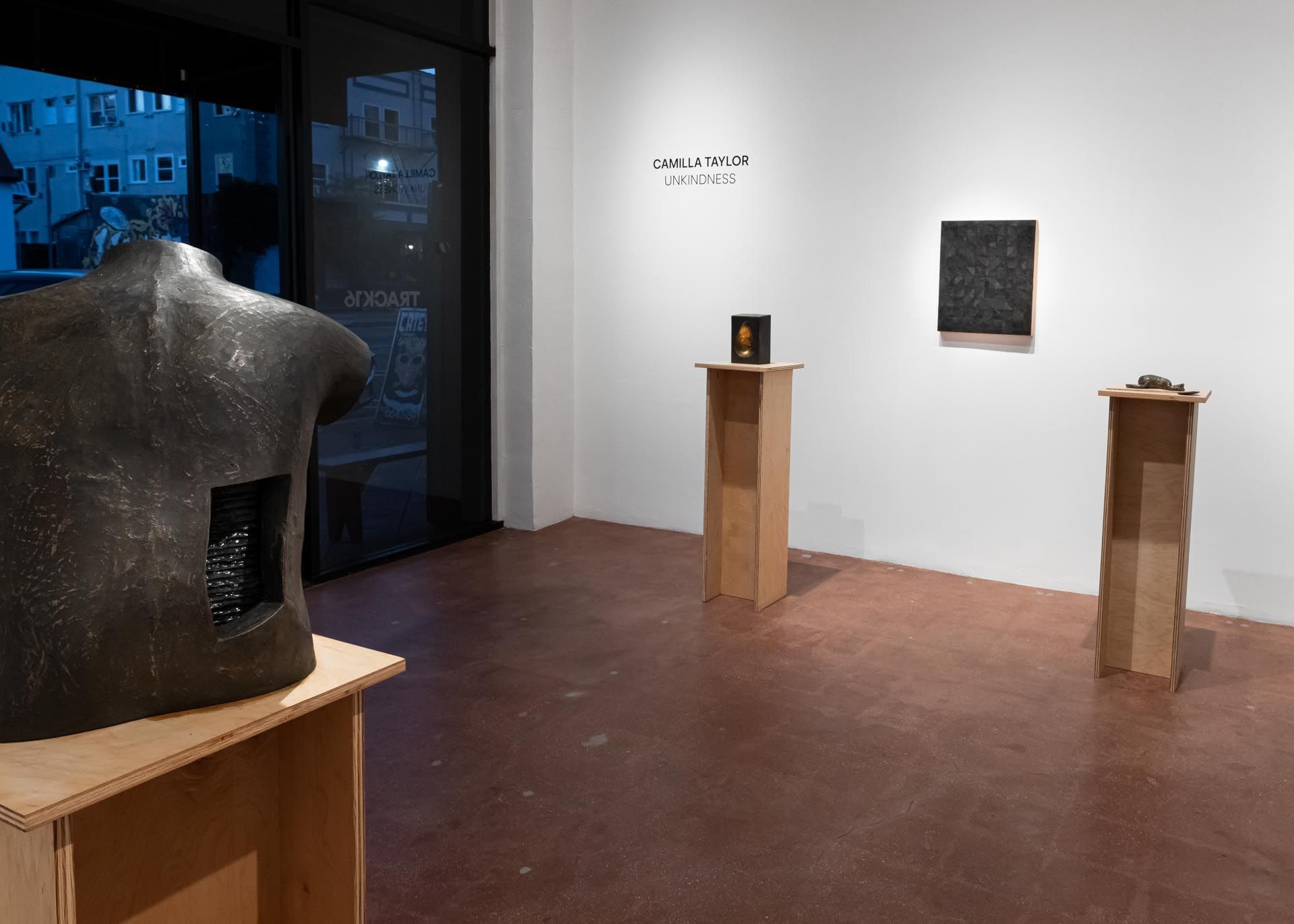 In its gallery in East Hollywood, Track 16 presents a new body of work by Los Angeles-based artist Camilla Taylor. In the exhibition titled Unkindness, Taylor explores both the vacuum of loss and the emergence into a new world and new self – radically unlike the past. Multiple bronze works – representations of the body – suggest an emptiness, a blackout. Cast from hand-sculpted clay and wax, they function as preservations of something made then lost. Stray, a larger than life human mandible, uncannily imbues itself with uncertainty and, separated from its body, threatens like an omen. Stomach, a bronze lidded container, holds inside a scented wax that visitors may sample. Taylor designed the scent to mimic how people have described the smell of scientific clean rooms, where hallucinations are induced by the brain in response to the lack of olfactory stimulus. Adding a waterfall inside a bronze torso, a square bowl with the imprint of a breast, a glass ear, and a roped glass foot amplifies the richly enigmatic vocabulary of the body that has developed.