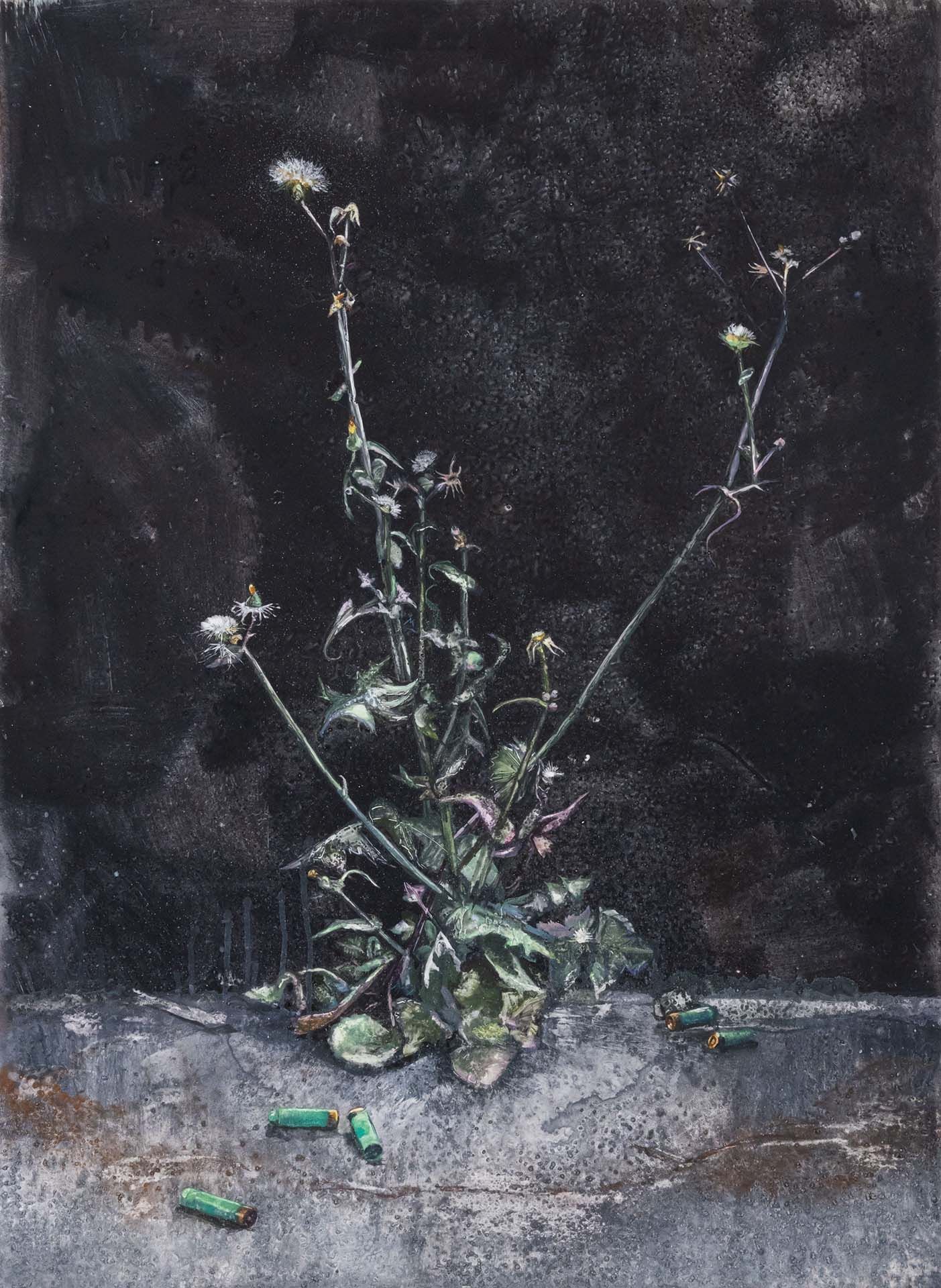 Her watercolors, made gritty by the use of salt, depict in loving detail weeds bursting from the concrete, a cigarette butt flattened into the ground with time, a dead bird in the gutter. Occasionally a reference to the tumultuous political moment emerges in the form of a zip tie or a rubber bullet. But the artist's persistent, fixed attention to the literal ground begs the question of what the artist's gaze is avoiding?