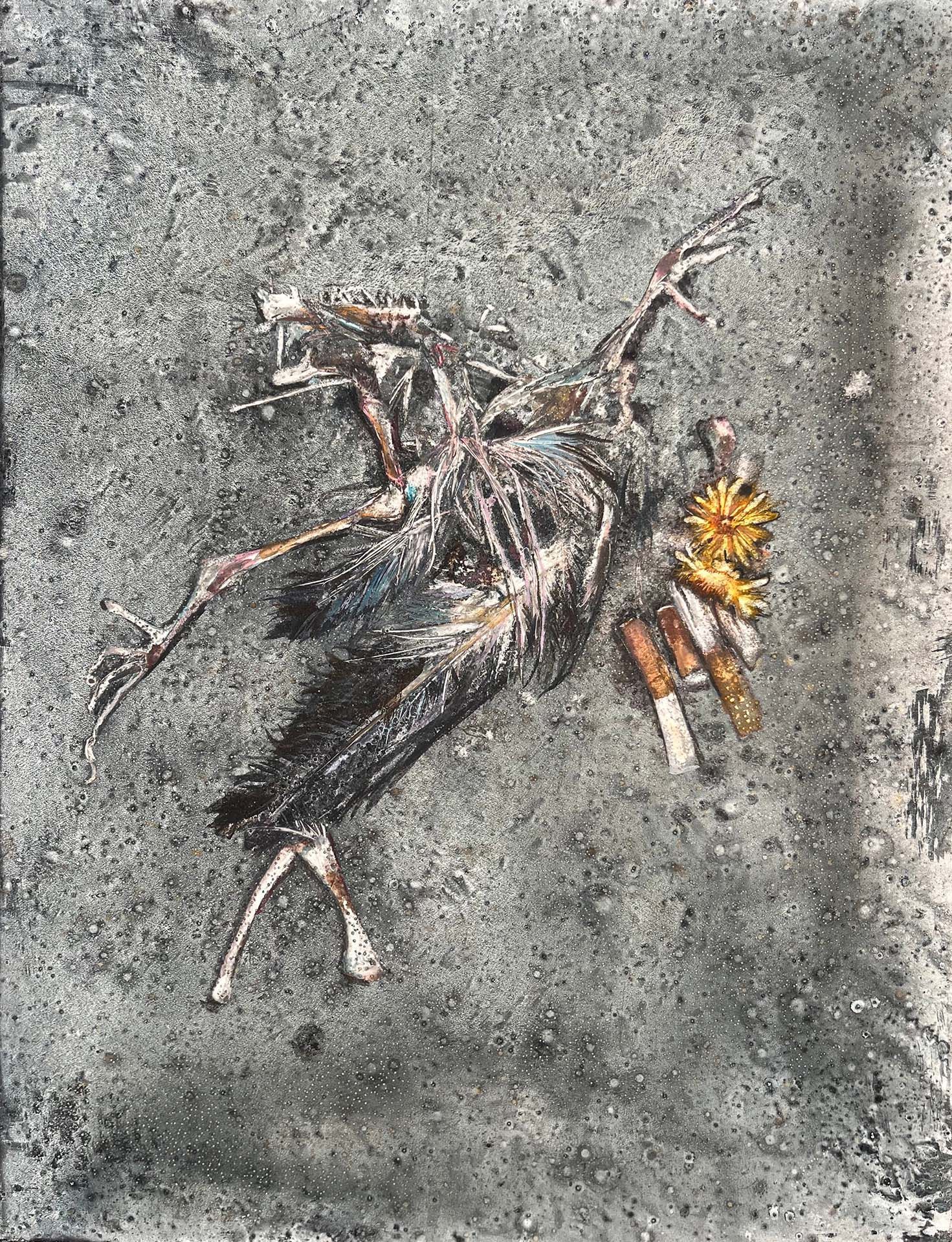 I help wheel the abandoned elote cart of a man who was snatched off the street in my neighborhood to a nearby home for safekeeping until someone can contact his family and tell them he is gone. Later in my studio, I hunch over my painting and in painstaking detail coax the form of an animal's decomposing remains out of an abstraction of green paint.