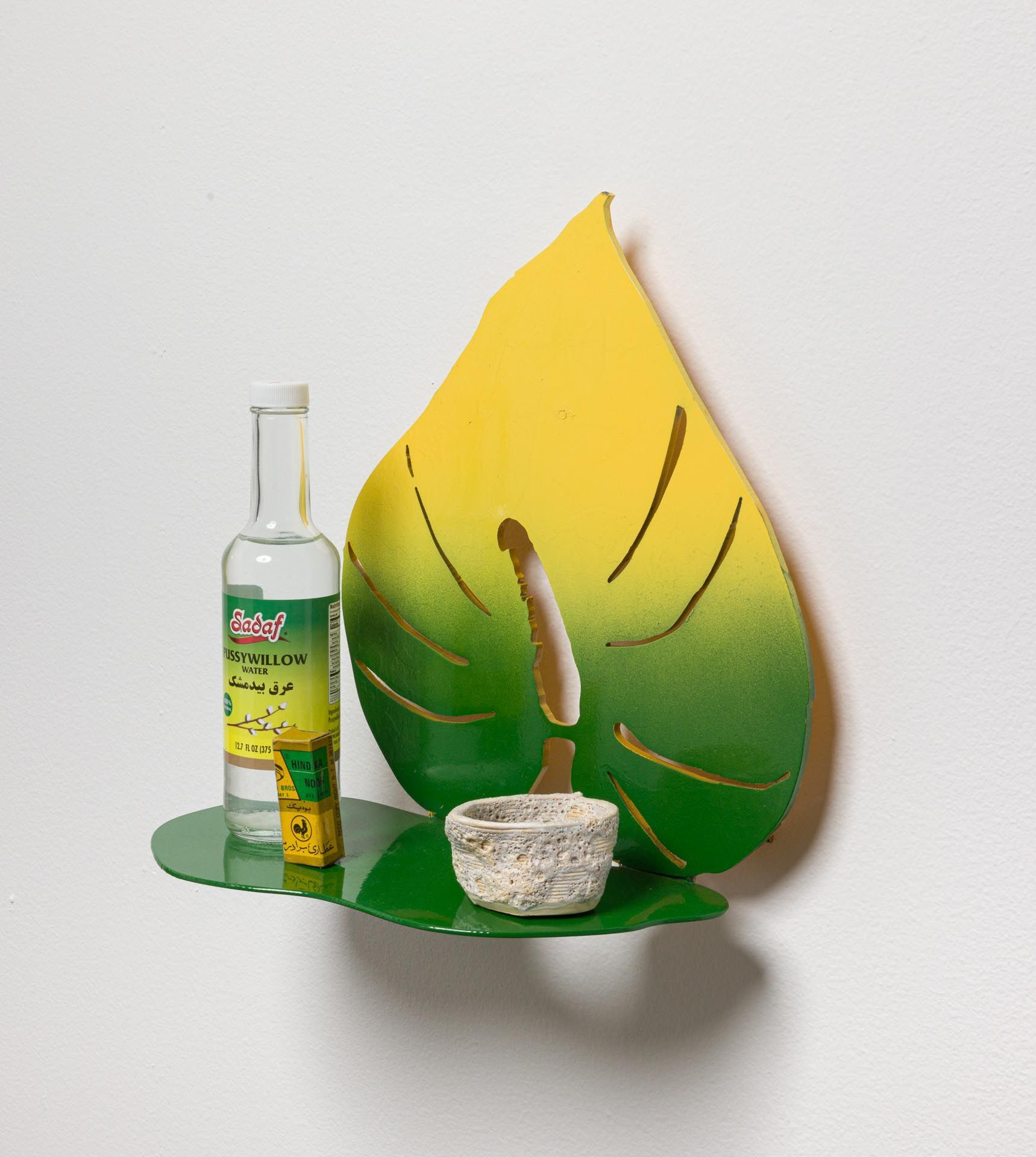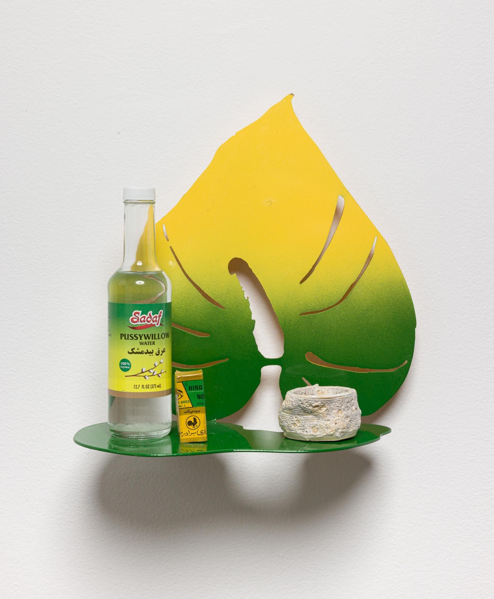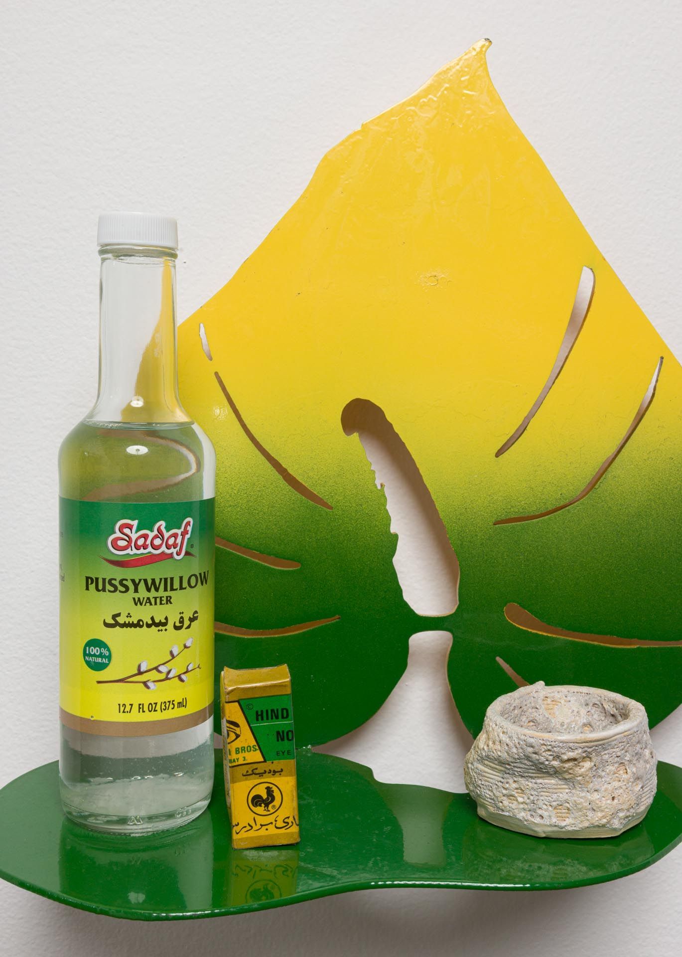 Powder coated steel, 3D printed ceramic (software and printing by Devon Frost), Iranian Kohlpowder, Sadaf pussywillow water