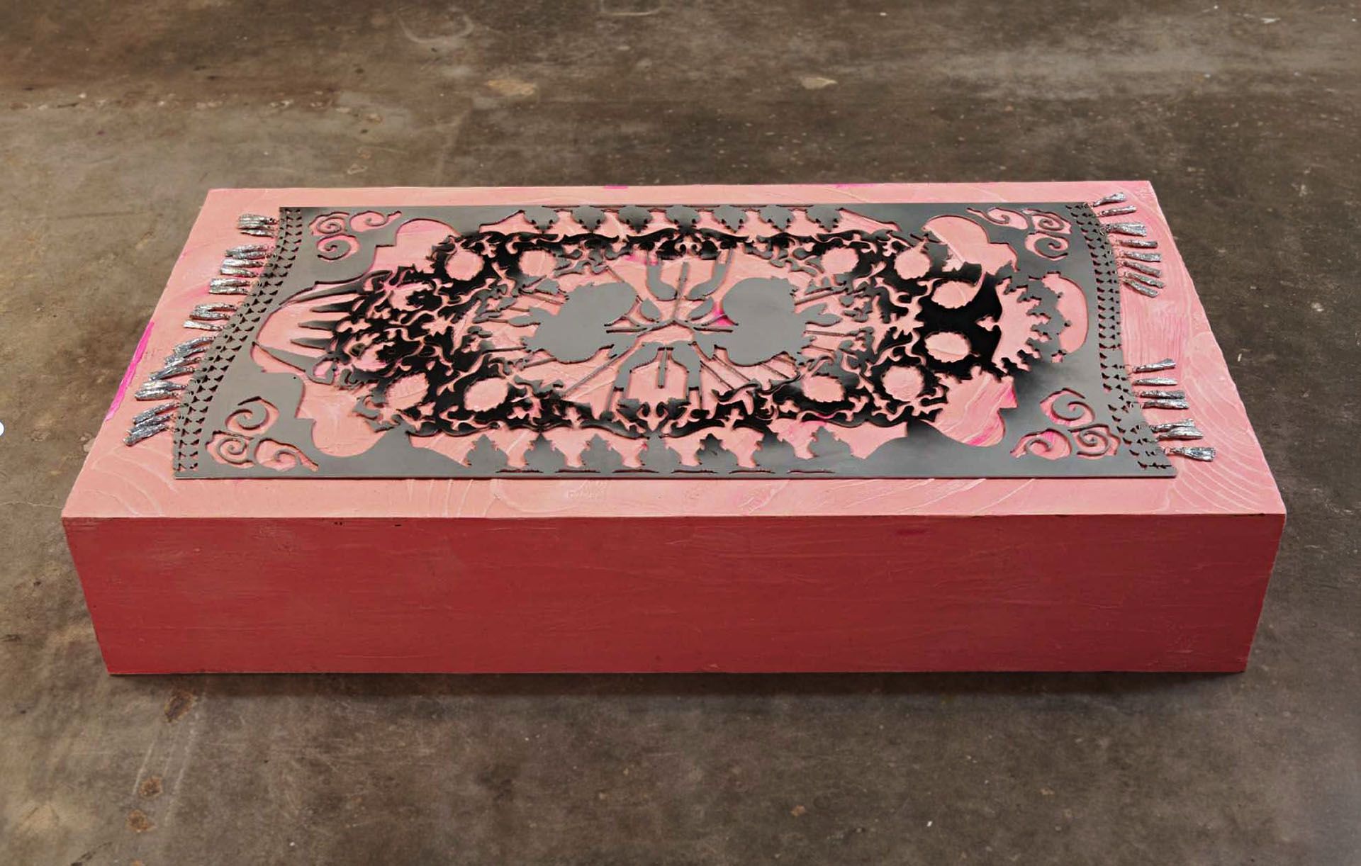 threadbare and held so long. 2025. Powder coated steel, aluminum, MDF, resin, FGR-95. 53 x 29 x 10”.